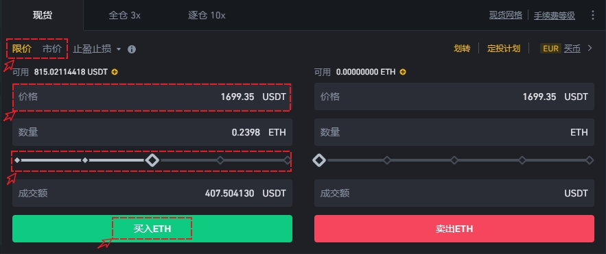 闪兑的数据取值,正来源于现货交易,在操作界面中可以查看代币的K线走势,买卖价格等信息,同样会区分限价挂单模式和市价直接成交的模式,这个根据个人需要选择。选择一个合适的价格后,下面的滚动条可以根据当前持有的另一个代币数量的百分比来设置买入数量,设置好以后,点击买入ETH即可。
