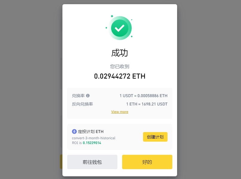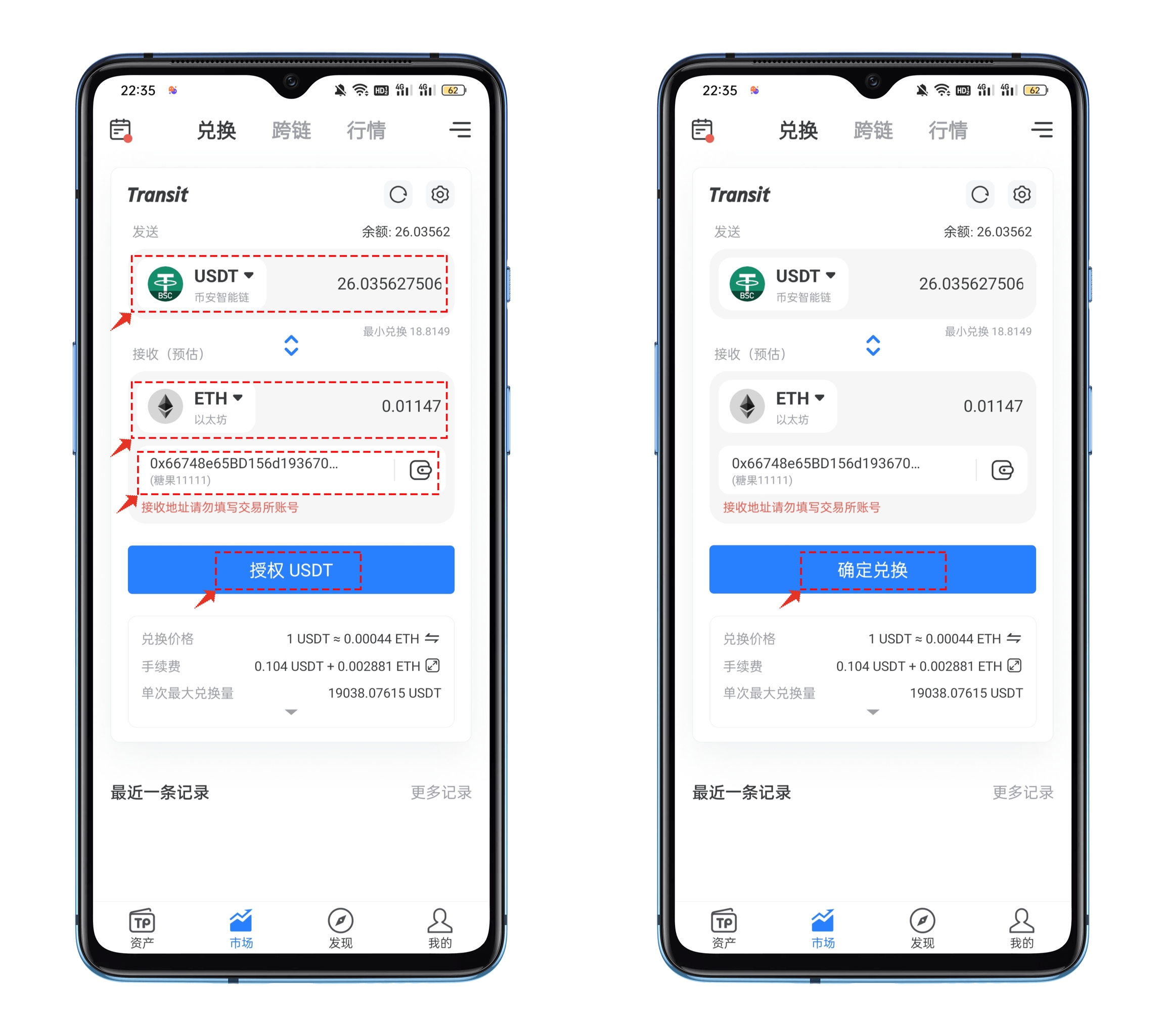 在打开的界面中设置需要兑出的代币(如USDT),选择需要兑入的代币ETH,然后选择以太坊钱包作为收款地址,请不要使用交易所的地址作为收款地址。