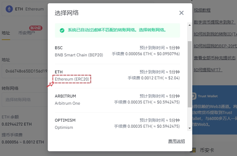 执行提币操作的时候,最重要的因素就是提币的网络选择和地址。点击转账网络,会弹出窗口提示,其中ERC20网络就是以太坊公链网络。